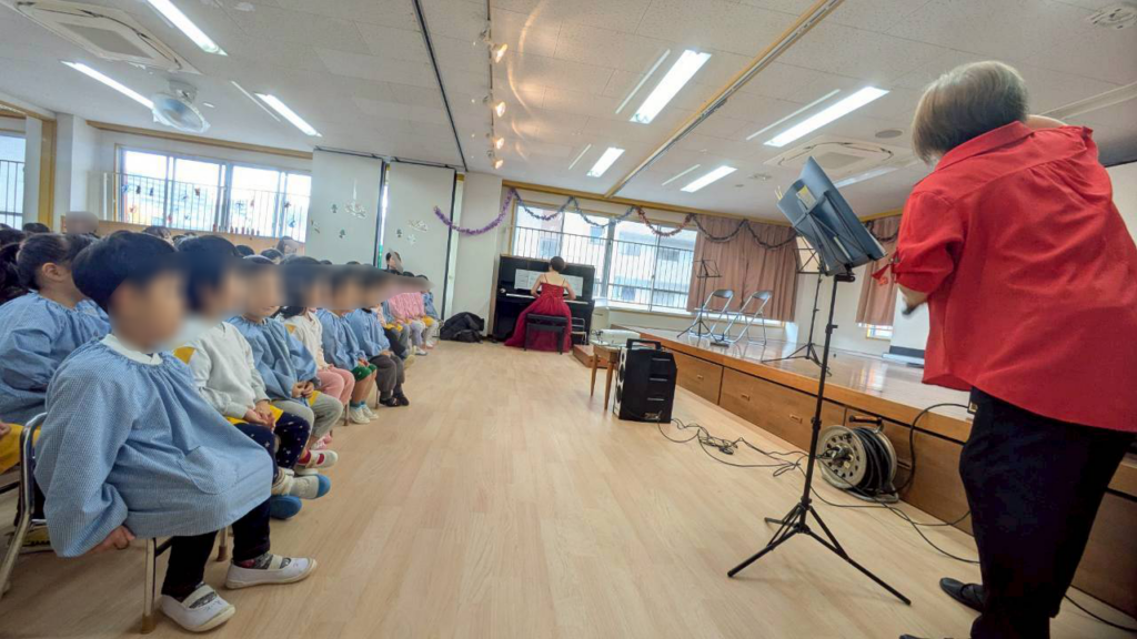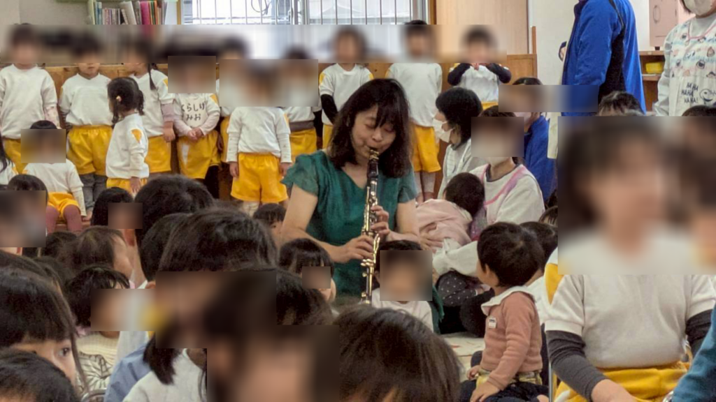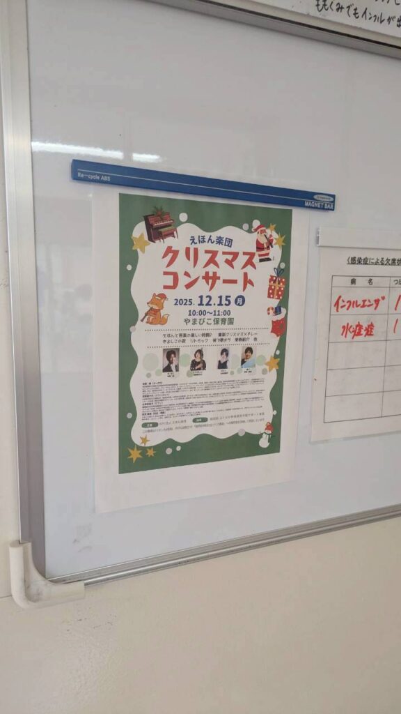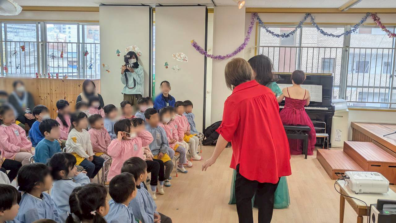 やまびこ保育園でクリスマスコンサーとをさせていただきました! えほん楽団活動 X Facebook コピー 2026.02.21 冒頭でクリスマスメドレーを演奏するとみんな大きな声で参加してくれました!こんなにたくさんの曲を知っていてびっくりしました! 楽しく音楽と絵本に参加していただきました🎵
