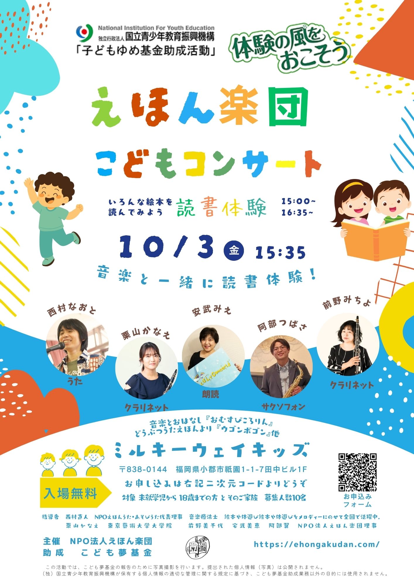 「体験の風をおこそう」をテーマに、音楽と絵本を融合させた新しい読書体験をお届けします。プロの演奏家による生演奏とともに、物語の世界を五感で楽しむ、こどもたちのための特別なコンサートです。 |