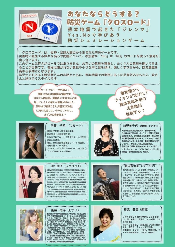 第17回震災チャリティーコンサート 防災ゲーム『クロスロード』 講演:工藤信孝 えほん楽団コンサート |