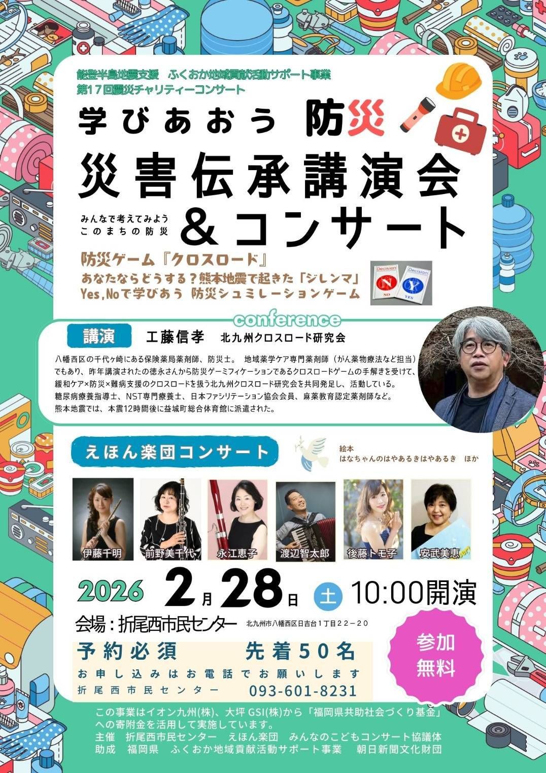第17回震災チャリティーコンサート 防災ゲーム『クロスロード』 講演:工藤信孝 えほん楽団コンサート |
