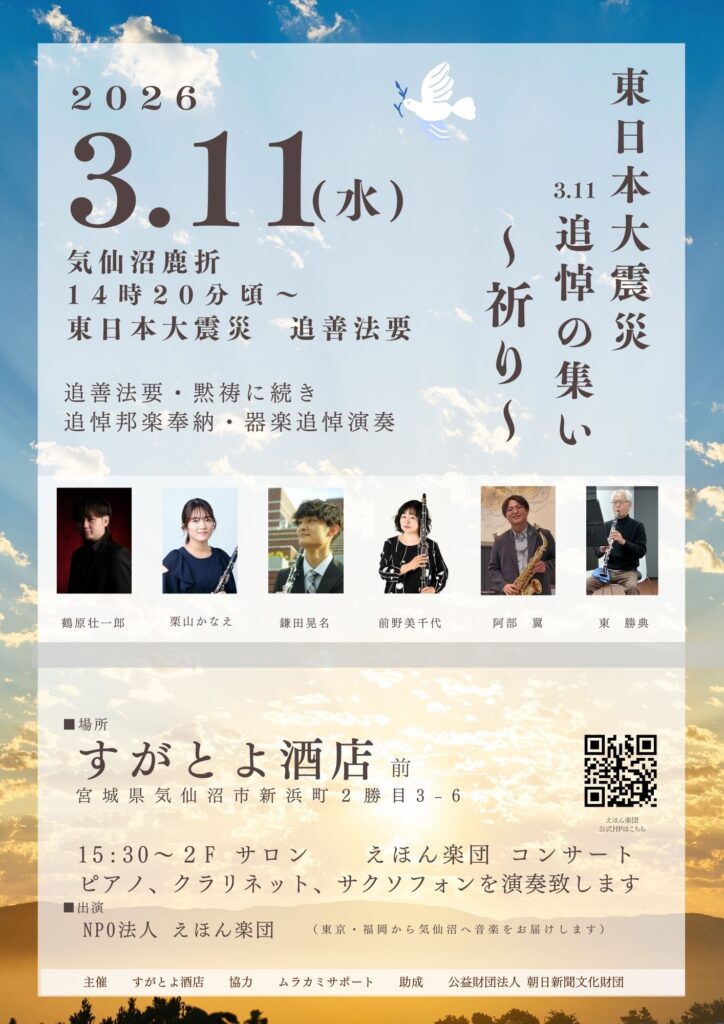 | みどころ | 東日本大震災から15年。気仙沼の地にて、祈りを込めた追善法要とともに、東京・福岡から集まった奏者たちが追悼の音色をお届けします。 |